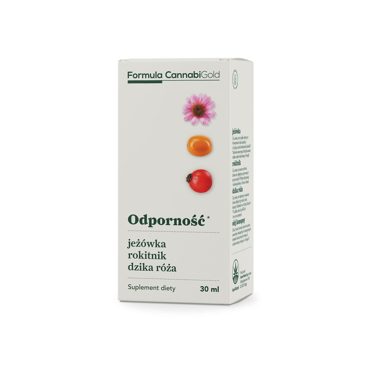 Olejek Formula CannabiGold „Odporność” to wieloskładnikowy suplement diety w oleju z nasion konopi. W formule olejku znajdziecie takie składniki roślinne jak jeżówka, rokitnik czy dzika róża. Potrzebowaliśmy aż 140 kg jeżówki aby wytworzyć 1 kg jej ekstraktu. Produkowane w całości w Polsce pod pełną kontrolą firmy HemPoland suplementy diety marki Formula CannabiGold to gwarancja najwyższej jakości. Produkty Formula CannabiGold zostały stworzone zgodnie z zasadą „clean label” – najprostszy skład, bez zbędnych dodatków. W produkcie odnajdziesz 100% składników z naturalnych źródeł.