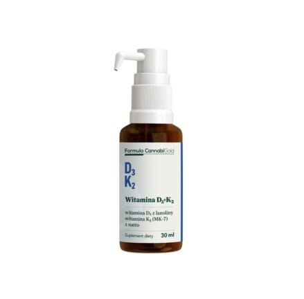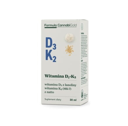 Olejek Formula CannabiGold „WITAMINA D3+K2” to suplement diety z witaminami D i K w oleju z nasion konopi. Dzienna porcja zawiera: 50 μg witaminy D3 (2000 j.m. – 1000% RWS*) oraz 75 μg witaminy K2 (100% RWS*). Produkowane w całości w Polsce pod pełną kontrolą firmy HemPoland suplementy diety marki Formula CannabiGold to gwarancja najwyższej jakości. Produkty Formula CannabiGold zostały stworzone zgodnie z zasadą „clean label” – najprostszy skład, bez zbędnych dodatków. W produkcie odnajdziesz 100% składników z naturalnych źródeł.